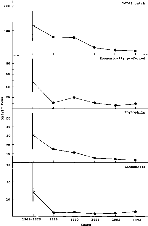 CONCLUSIONS The long-term (1961-1979) mean annual catch of recreational fishery before the damming of the Danube (in October 1992) was 109.96 metric tons and the catch of economically preferred (EP), phytophilous (P) and lithophilous (L) groups was 47.7, 31.0 and 14.4 tons, respectively. In 1993, one year after the damming the total catch dropped to 17.5 tons and that of EP, P and L to 8.6, 3.6 and 2.8 tons, respectively. In comparison with the long-term annual catch, the total catch and the catch of particular groups was by 84.1, 81.1 and 80.7 per cent less. These data correspond with the earlier prediction [2]. The reason of this dramatic catch decline is a destruction of the functional inland delta and a loss of spawning, nursery and wintering grounds for the most important species of fish.