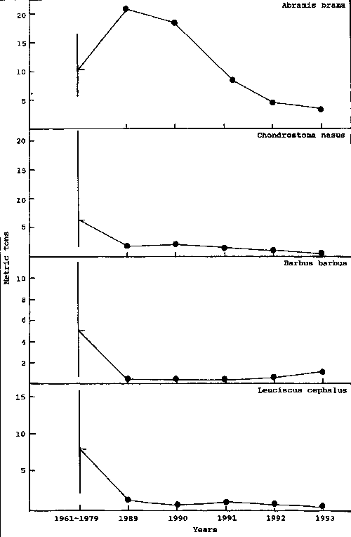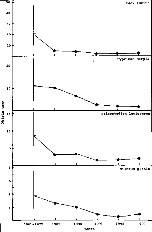 In 1993, one year after damming of the Danube, the total annual catch with angling was 17.5 MT only and represented a decrease by 84.1% as compared with years 1961-1979. The catch of commercially preferred, phytophilous and lithophilous species were 8.6, 3.6 and 2.8 MT, respectively, which represents the decrease by 81.1%, 88.2% and 80.7%, respectively.