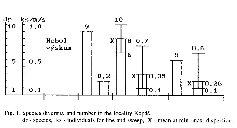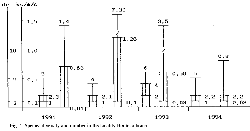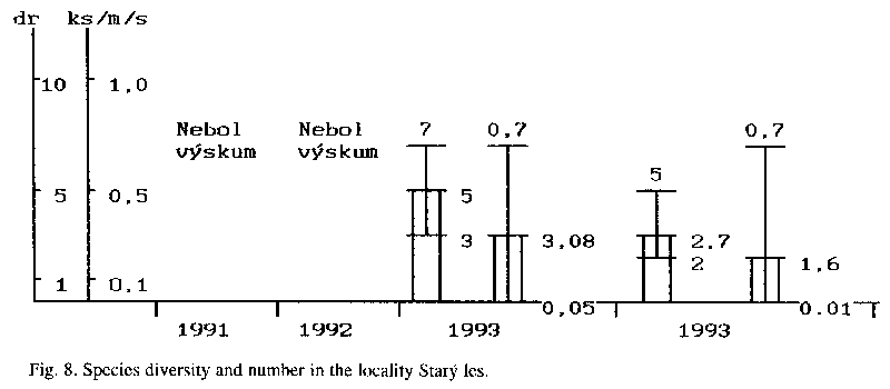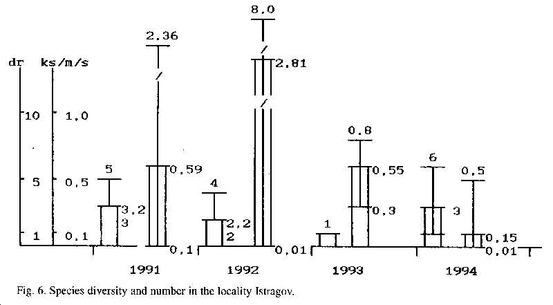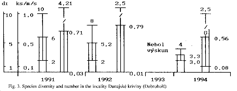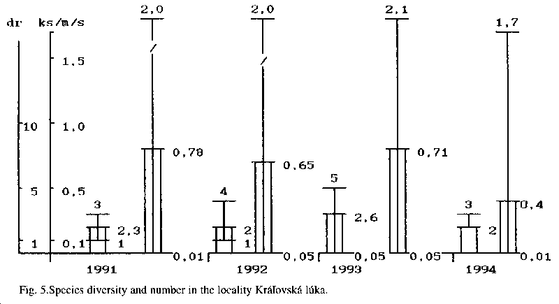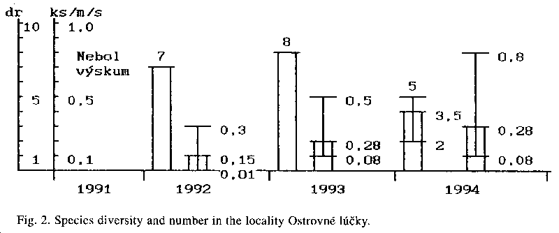 We have recorded the occurrence of 10 species of amphibians in this locality. The species diversity varied from 5 to 9 species in individual years (1992-1994) - Fig. 1. The largest number of species was observed in 1992-1993. The average abundance of all species was between 0.2 - 0.35 individuals/m/s (s - sweep), at the minimal and maximal range of 0.1-0.7 individuals per unit. The amphibian taxocoenosis is stable in this locality now.