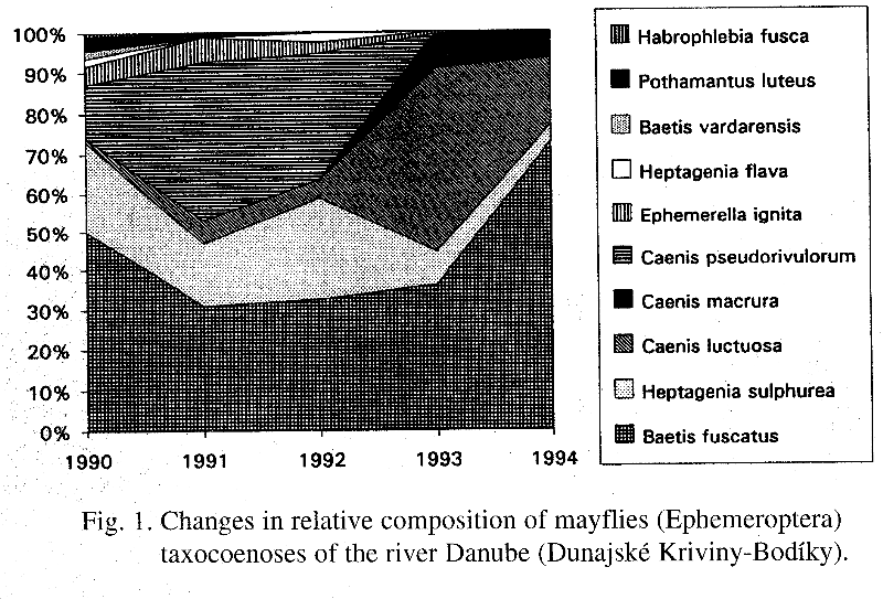 Since November 1992 the derivation of an essential amount of the Danubian water influenced the structure of mayflies in the old river-bed of the Danube, in comparison with the results of other authors [5, 15, 16]. In the mayfly taxocoenoses of the river Danube (Fig. 1) the more asserted species Caenis luctuosa and C. macrura can be observed, instead of the originally dominant Danubian taxocoenose, Caenis pseudorivolorum. The above mentioned two species are flying to this area from their original hatching areas, the Danubian river arms. In the summer period there is an abundant spread of the summer generation of Baetis fuscatus in the river Danube, sometimes accompanied by the species Heptagenia sulphurea. However, other species, regularly occurring in the past, are not record anymore.