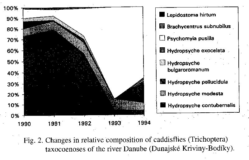 Very surprising also, is a gradual discontinuing succession of the caddisfly taxocoenoses of the river Danube. Psychomyia pusilla has prevailed since 1993 (Figure 2). Hydropsyche modesta has began to prevail among filtrates, because this species does not as such pretend to rheophility as the other species, and in addition, is tolerant to a large dispersion of the temperature amplitude of flowing water. It prevails, for example, in less watered plain flows of the river Morava [17]. This situation very closely approaches the results of long-past hydrobiological observations in the river Rhone [3]. In 1994 another two species with similar characteristics - Hydropsyche pellucidula and H. exocellata - were attached to this species. These three species prevail above the former dominant Danubian forms of Hydropsyche contubernalis and H. bulgaroromanum, of which the total share increased in 1994.