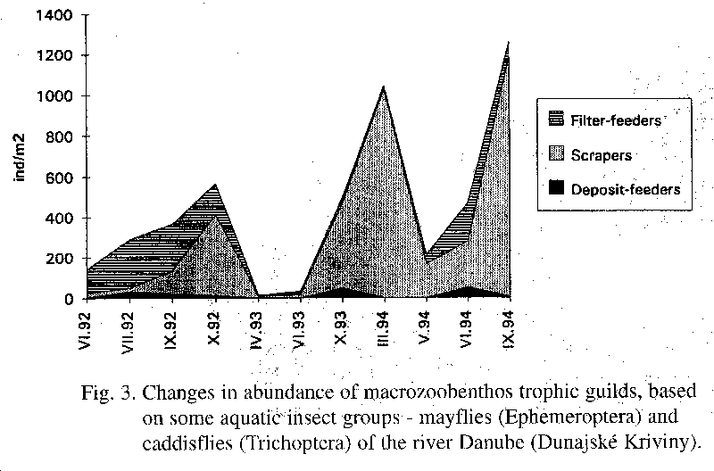 Different development of changes of quantitative and qualitative parameters of macrozoobenthos trophic guilds in the river Danube can be illustrated in two profiles of the old river-bed. The subjects are stretches with different streaming and speed of sedimentation of inorganic material to the river bottom. In the profile of Dunajske kriviny (a rheophile stretch with a rocky bottom) a significant increase of scrapers was represented by the species Psychomyia pusilla and Baetis fuscatus (essentially in this period biomass of periphyton in the old river-bed bottom increased) occurred after the marked depression at the end of 1992 (Fig. 3), and in the first half of 1993. In 1994 a certain stabilisation of filtrators occurred, but on a different quantitative and mainly qualitative base. The abundance of macrozoobenthos (mayflies and caddisflies) increased significantly in comparison with previous periods, and in comparison with other Danubian localities (Table 2). It is connected with a high trophic level (high periphyton biomass) of this stretch of the river Danube in 1994 (stabilisation of the bottom, increased transparency and a decreased average depth in the water table). A similar result was obtained by Tirjakova and Matis [20] at the study of ciliated protozoa.